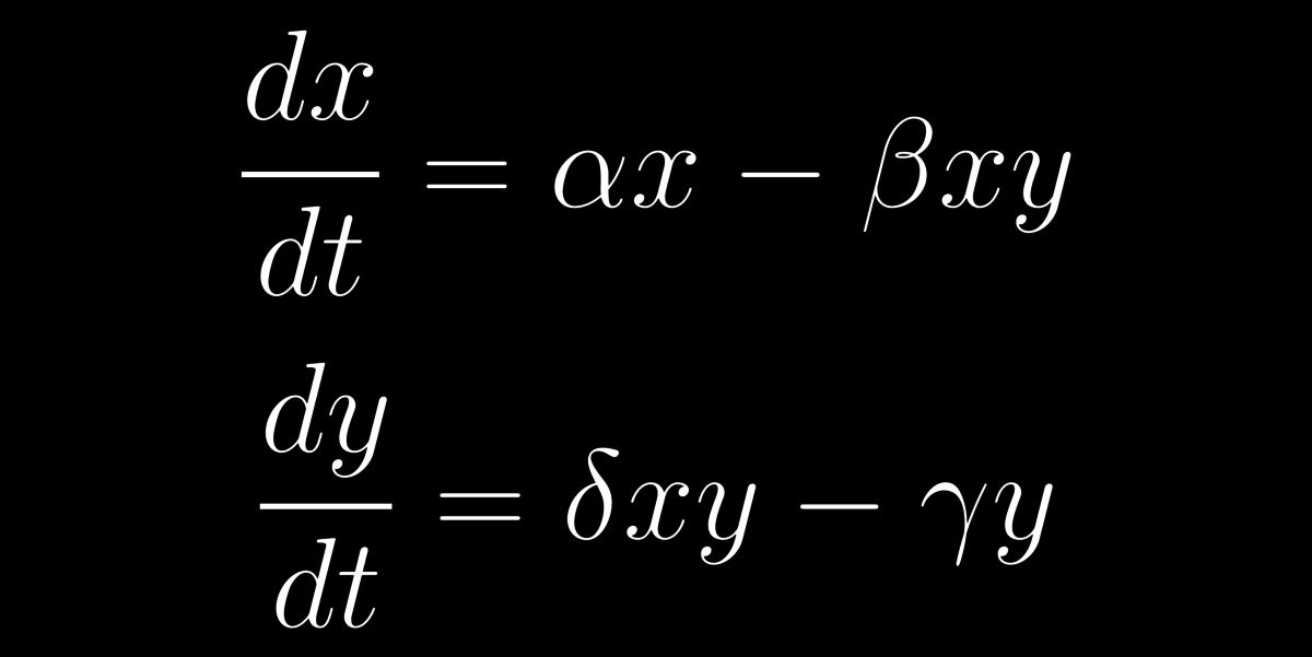 The Lotka-Volterra equations describe the constant fight between predator & prey. Prey population is governed by the 1st eq. If there's plenty of prey (large x), the number of predators (y) will increase, that is if they "interact" (β,δ≠0).